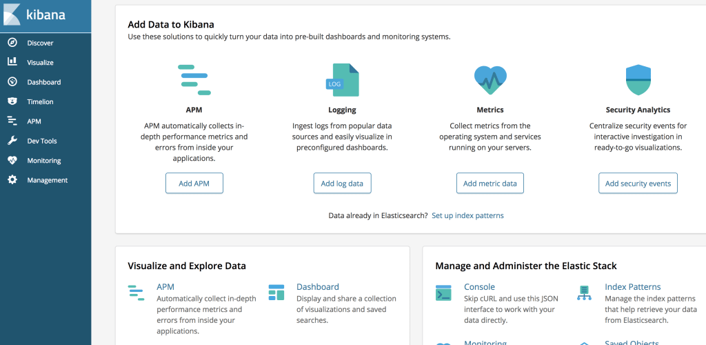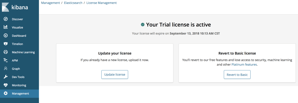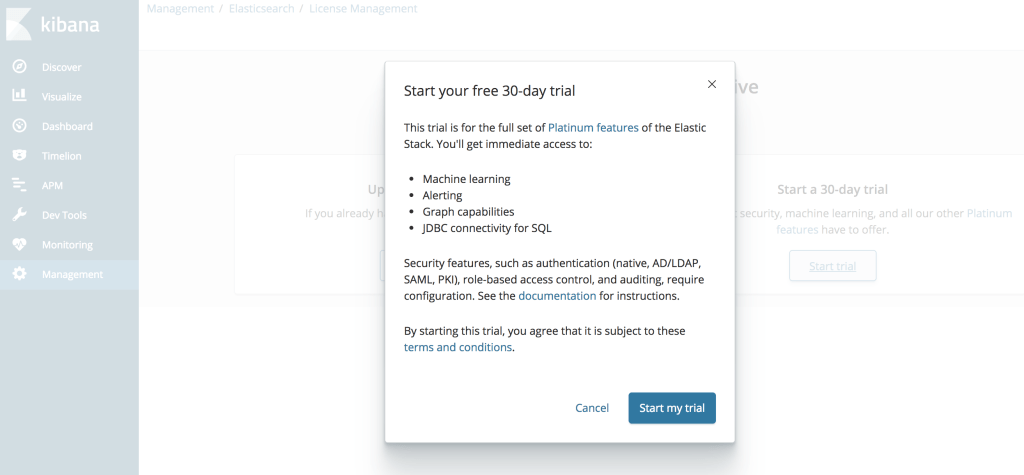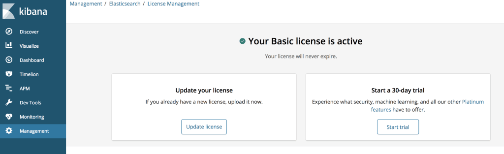 3.Visit kibana, http://localhost:5601, you will see the dashboard, next we will enable 30-day-trail license.