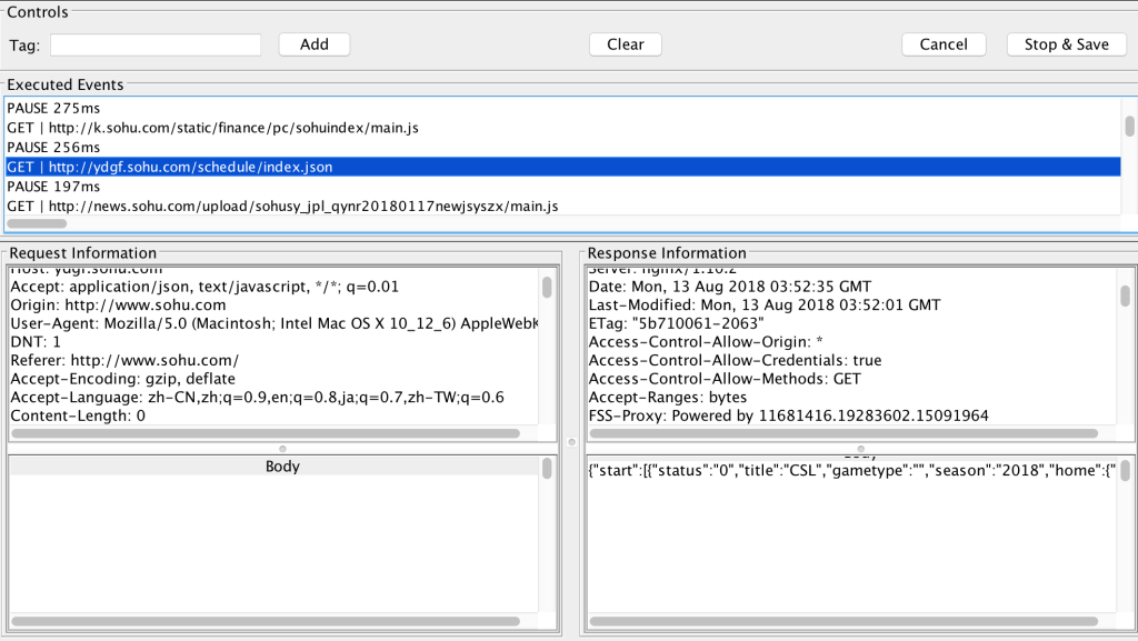 Please configure the proxy port and click Start button. Then you could set your browser proxy and surf the target URL, gatling will capture the content as below: